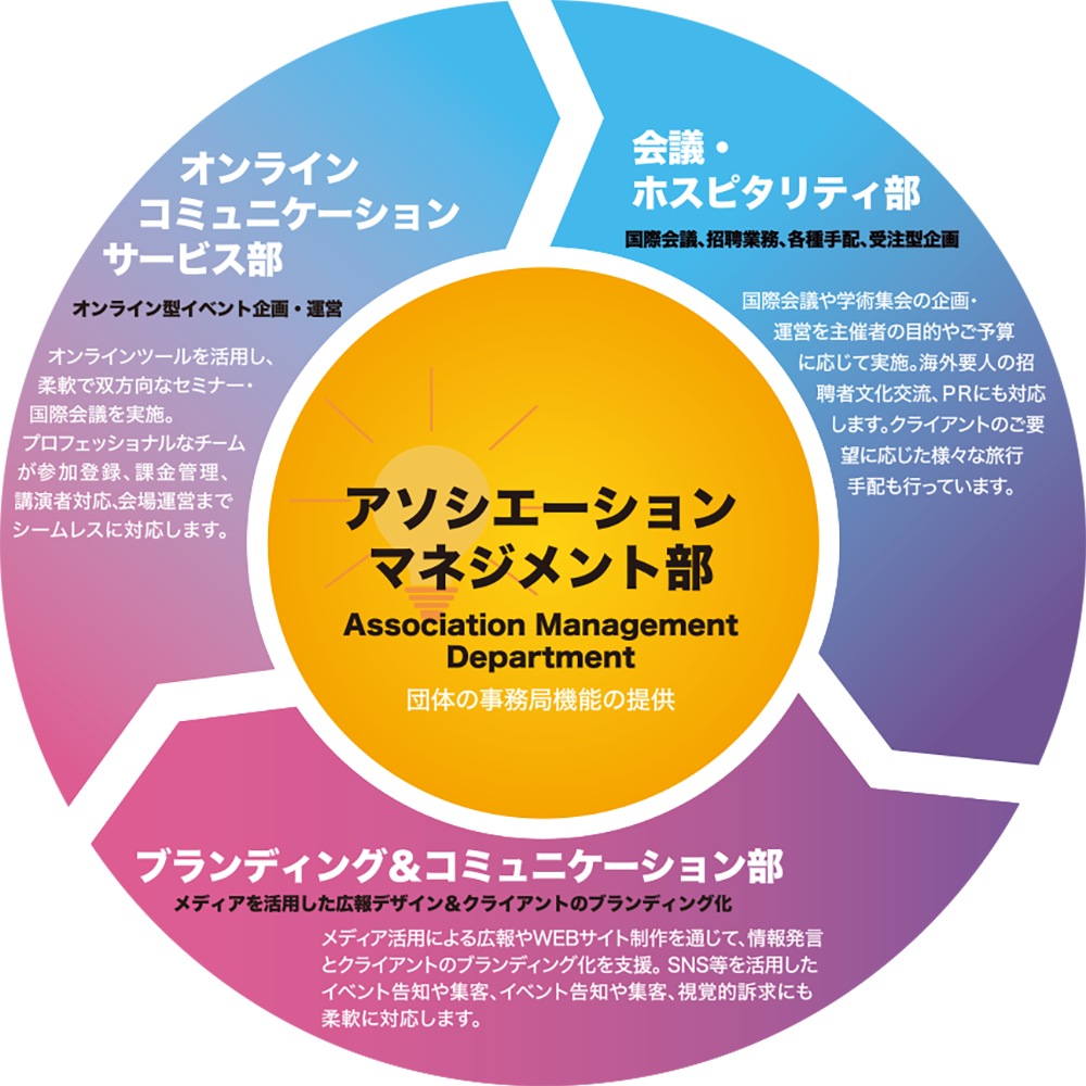 アソシエーションマネジメント(団体管理事務局業務)をコアビジネスに、学術会議・非営利団体の事務局業務全般を受託し、国際会議や学術集会、各種セミナー、展示会等、目的と予算に応じた企画・準備・運営を心掛けております。